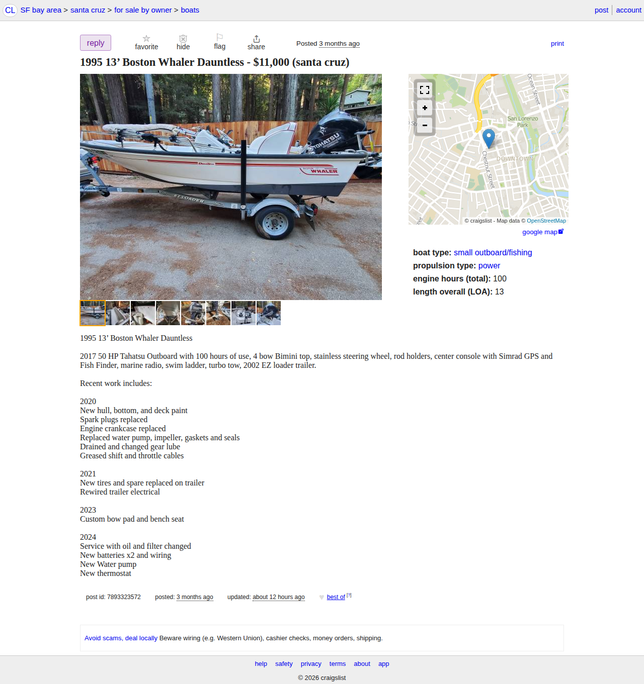 1995 13' Boston Whaler Dauntless w/ 2017 Tohatsu 50HP